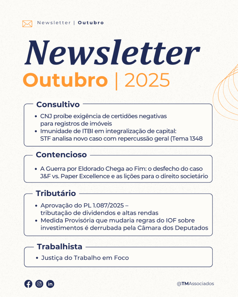 Todo mês, a equipe TM Associados traz uma newsletter com temas essenciais para o sucesso do seu negócio. Abordamos de forma prática e objetiva os principais destaques em Consultivo, Contencioso, Trabalhista e Tributário, ajudando você a tomar decisões mais seguras e estratégicas. Não perca essa oportunidade de transformar informação em vantagem competitiva! 📩